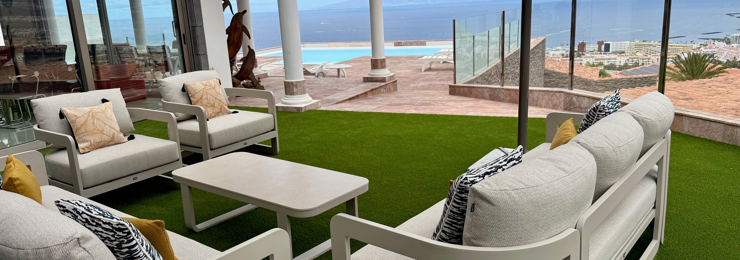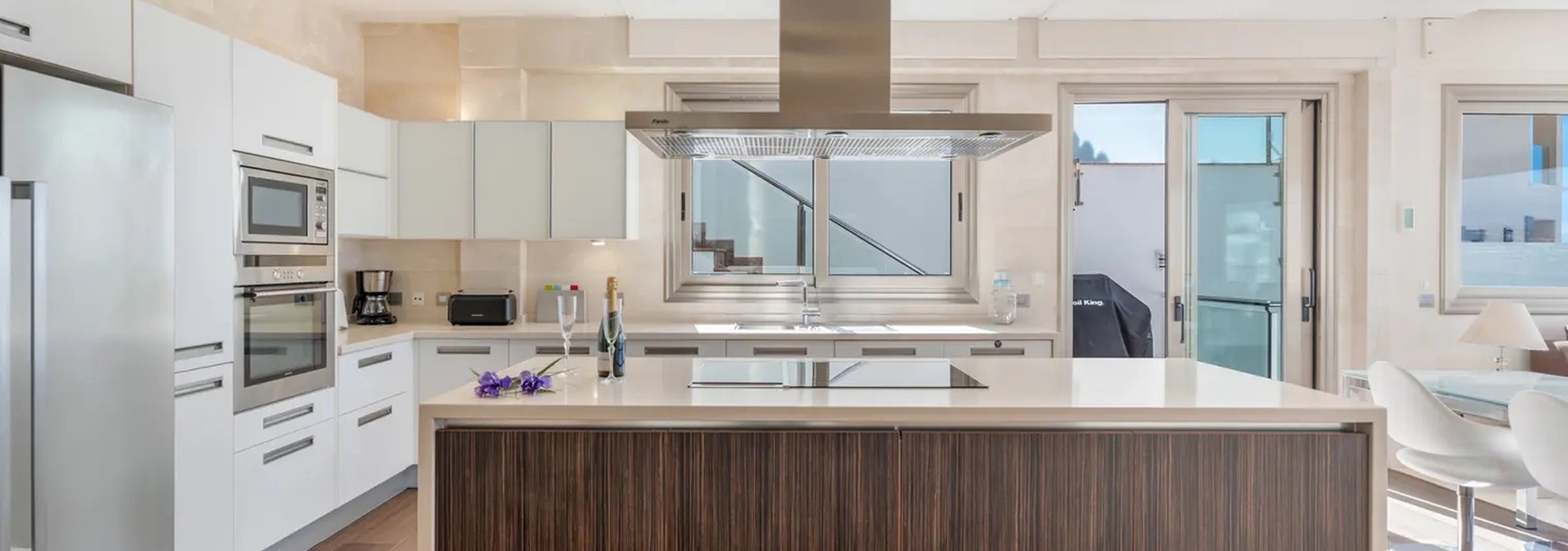 - Floor-to-ceiling glass doors open onto the terraces, BBQ area, and infinity pool.