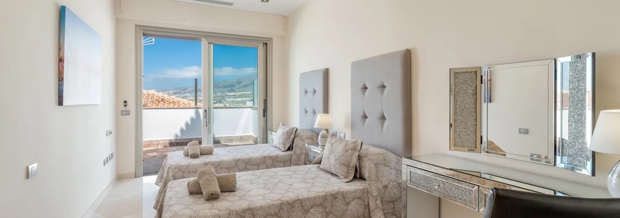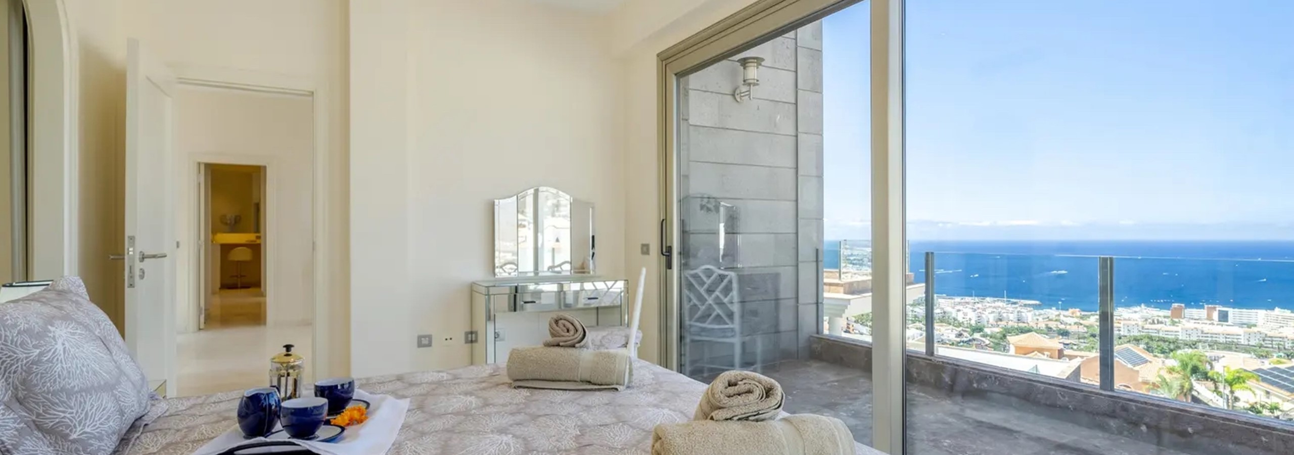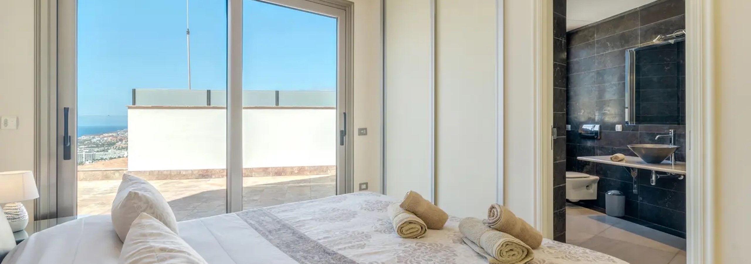 - Master Suite: Indulge in the spacious master bedroom, featuring a superking-size bed, Wide Screen Tv offering UK & Sky channels, a seperate dressing room, and a luxurious ensuite bathroom complete with a walk-in shower, twin sinks, a jacuzzi bath, bidet, and toilet. Step out onto the expansive balcony from the bedroom to enjoy breathtaking views of Adeje and the ocean while lounging on the sunbeds.