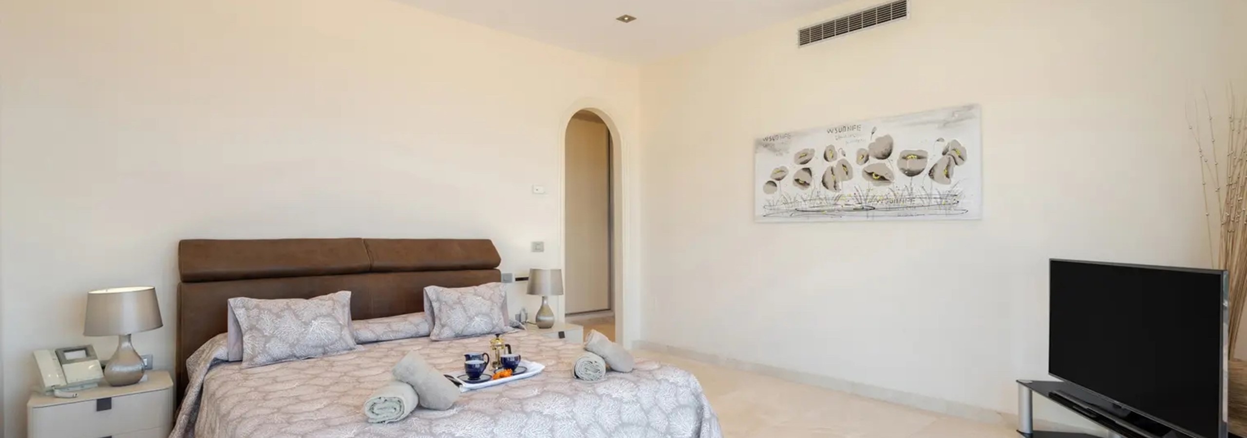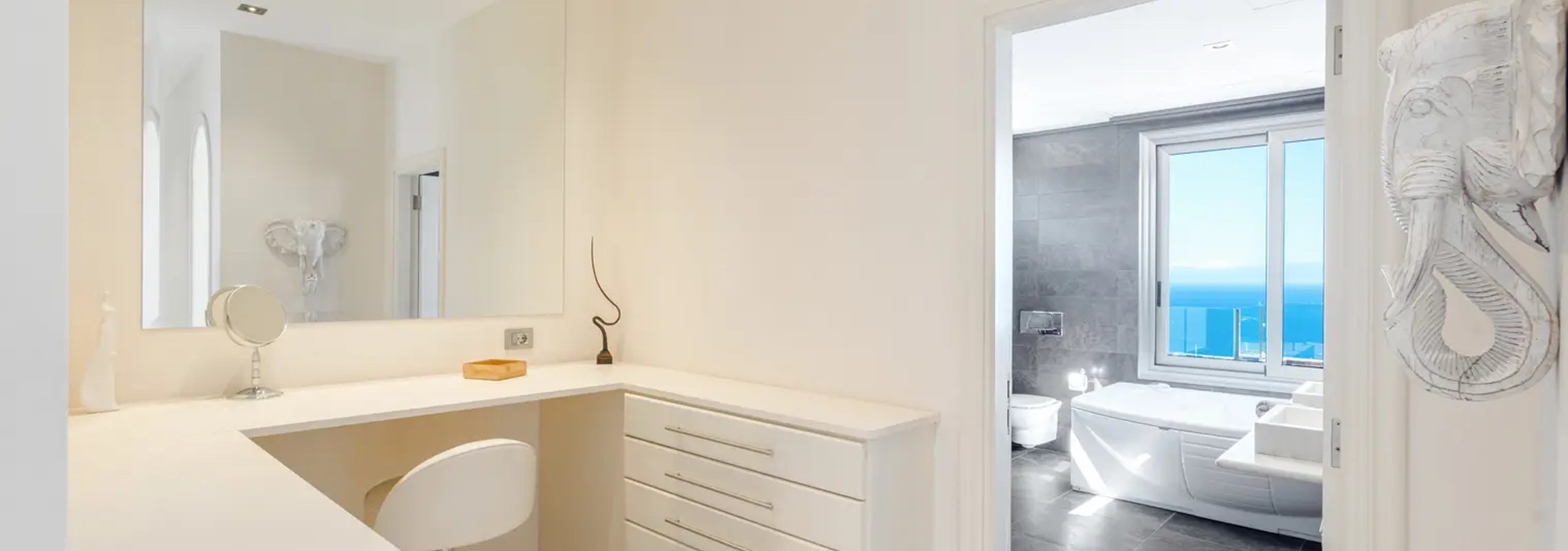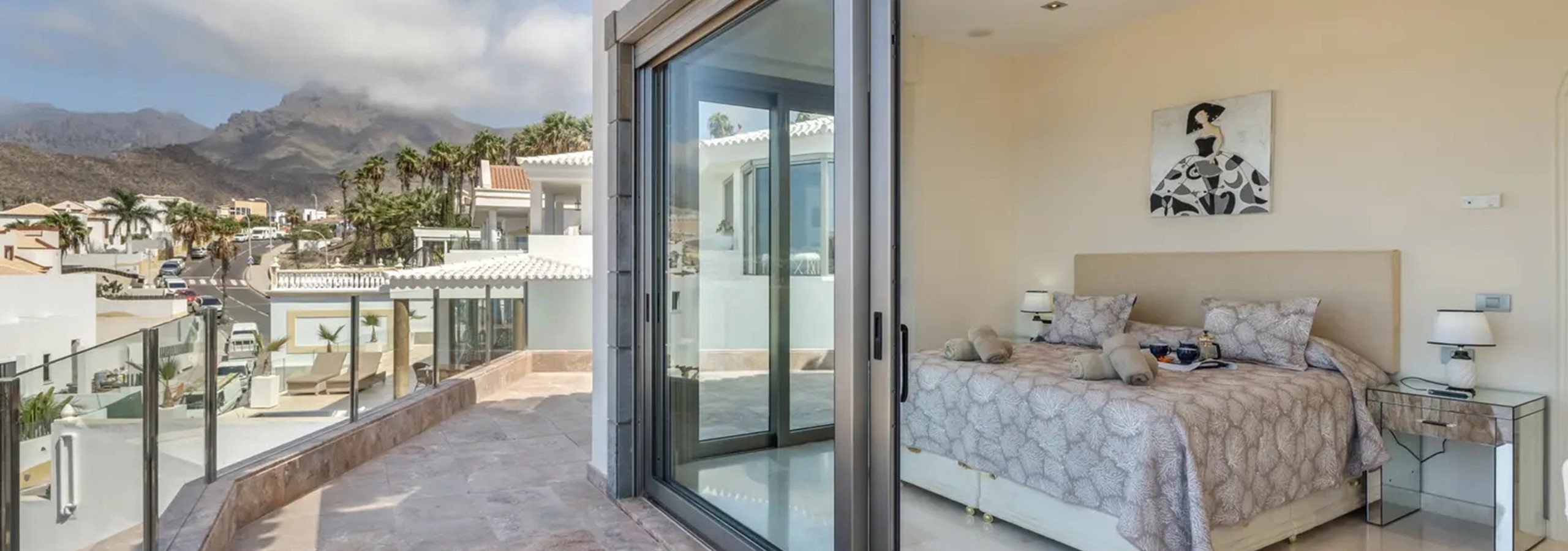 - Master Suite: Indulge in the spacious master bedroom, featuring a superking-size bed, Wide Screen Tv offering UK & Sky channels, a seperate dressing room, and a luxurious ensuite bathroom complete with a walk-in shower, twin sinks, a jacuzzi bath, bidet, and toilet. Step out onto the expansive balcony from the bedroom to enjoy breathtaking views of Adeje and the ocean while lounging on the sunbeds.