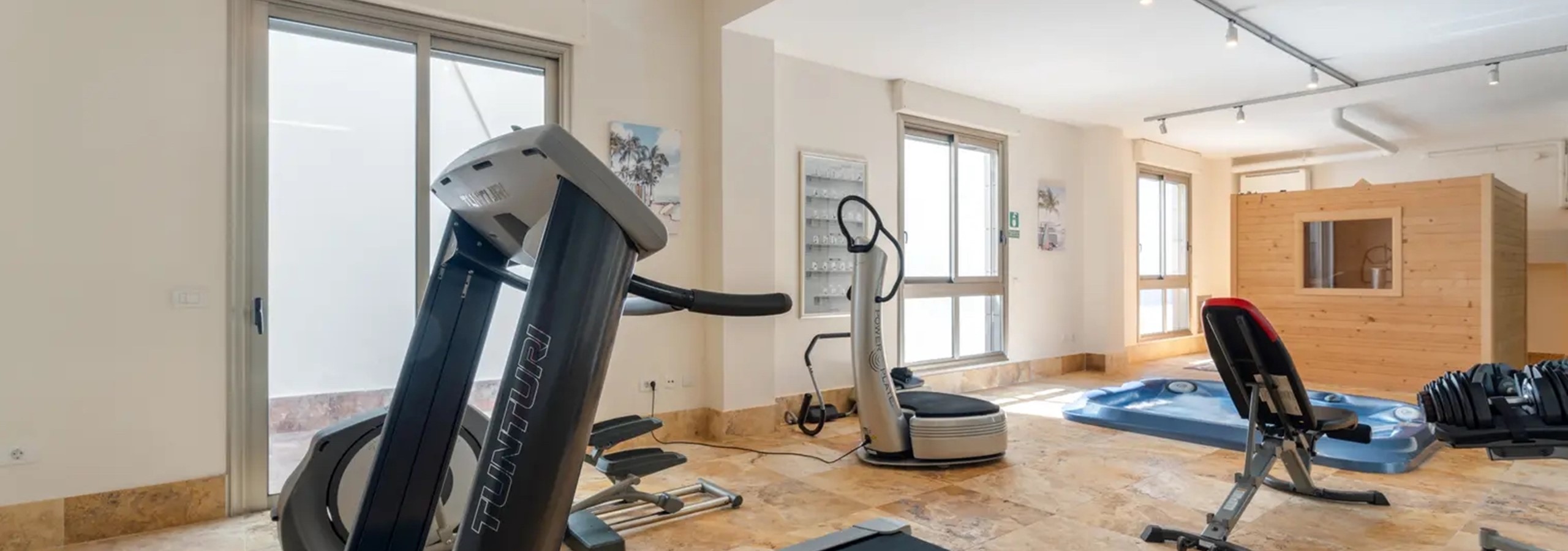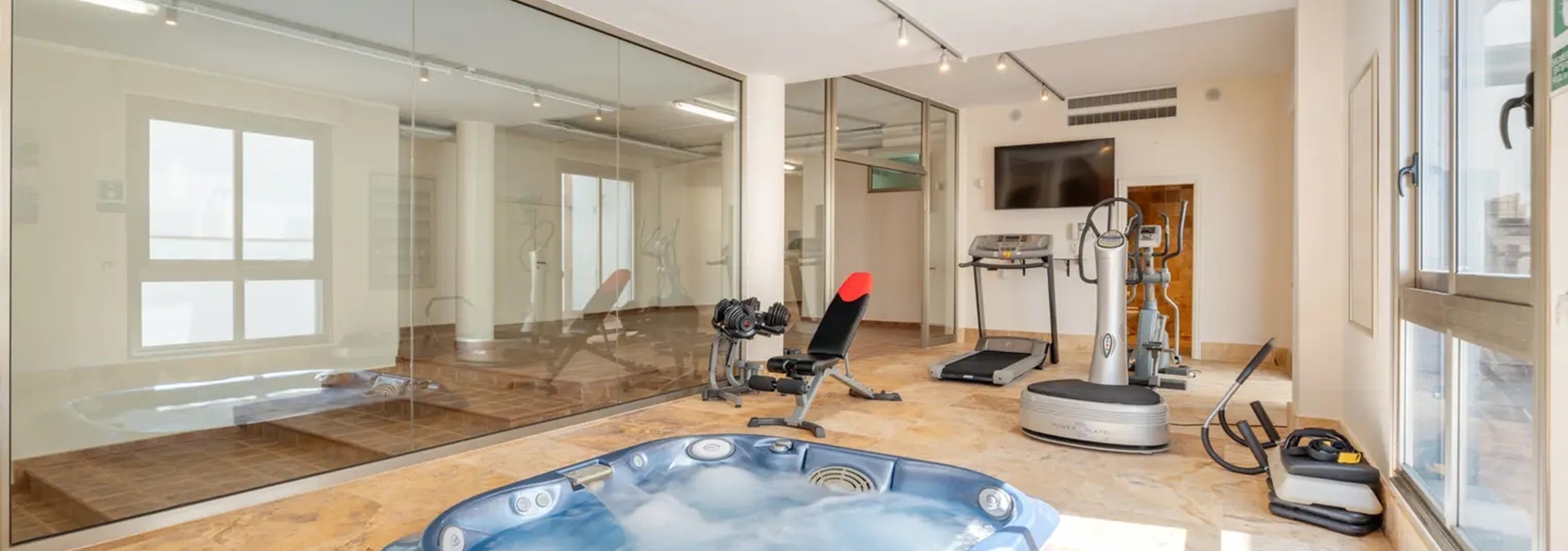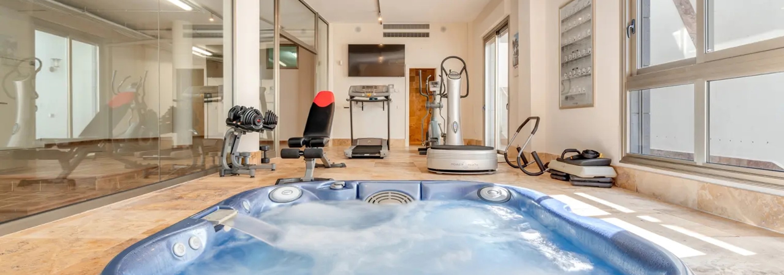 - A spacious Gym and Spa area featuring fitness equipment, sauna, jacuzzi, and shower room.
