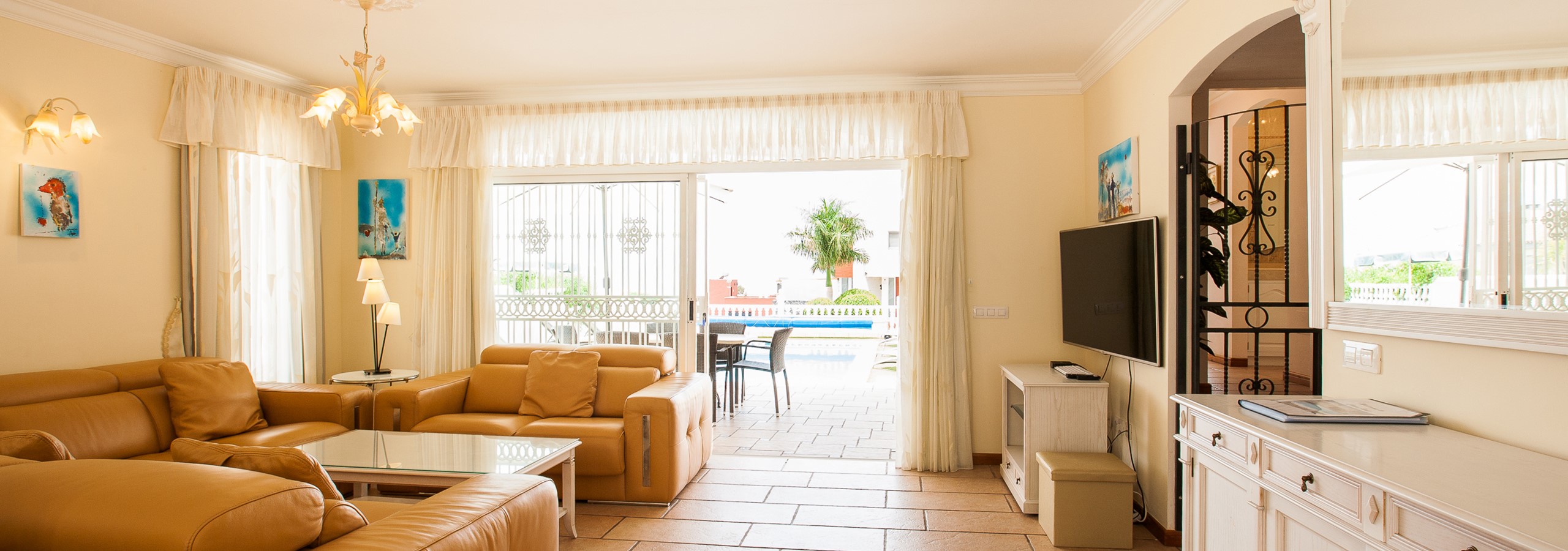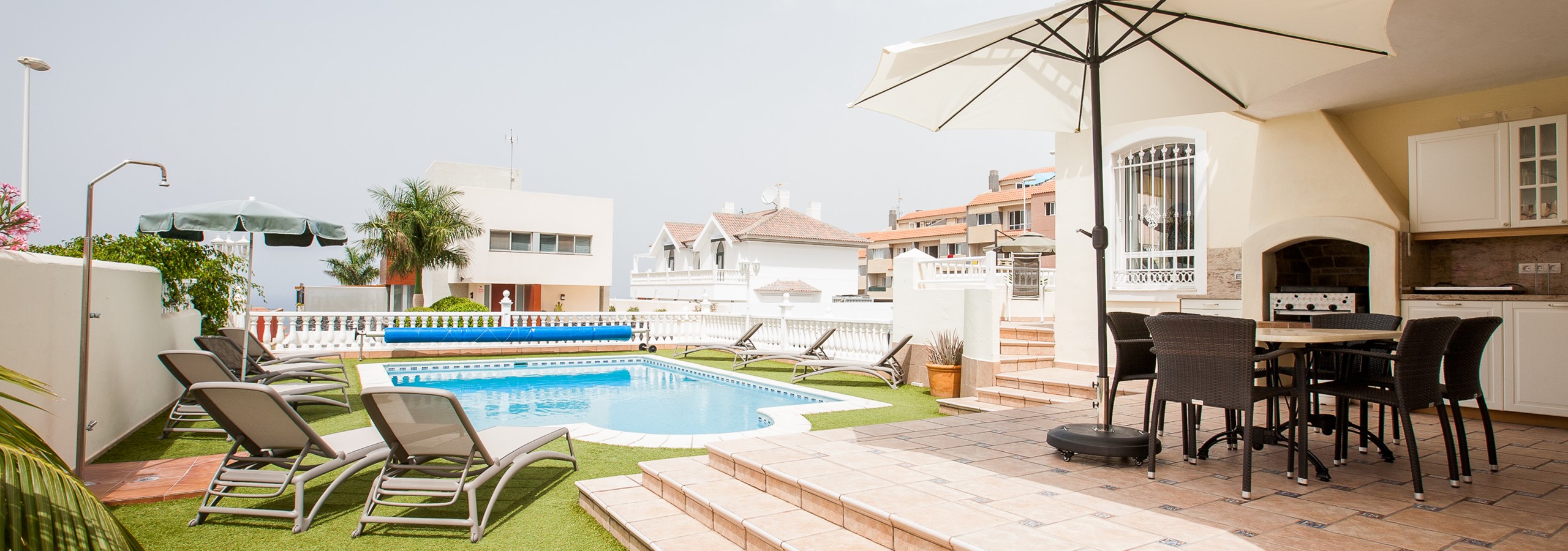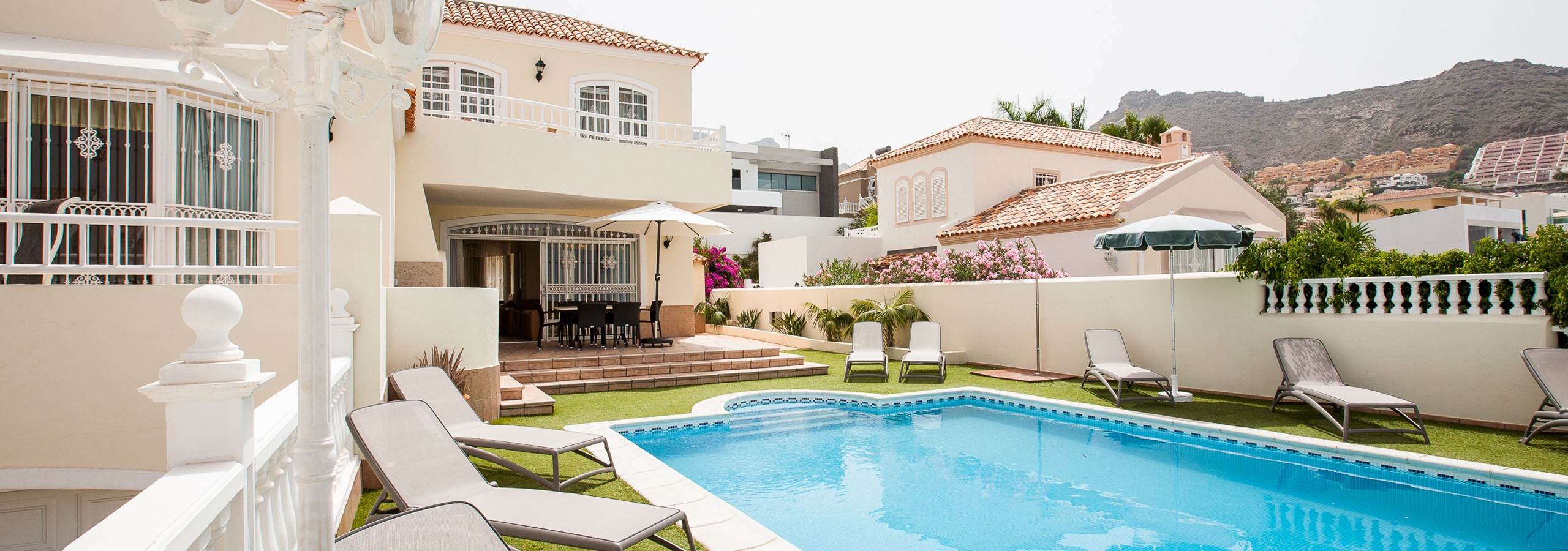 This is a great villa in a pretty quiet location that is about 15 - 20 minutes walk down to Playa Fanabe, or around 4 - 5 euros if you take a taxi. It has a very large master bedroom with 3 other good size double bedrooms, with a good size kitchen and living area with a huge TV with access to sports channels. The pool is a good size and the water temperature was nice. There are a number of supermarkets, restaurants, bars and a great spa all within walking distance.