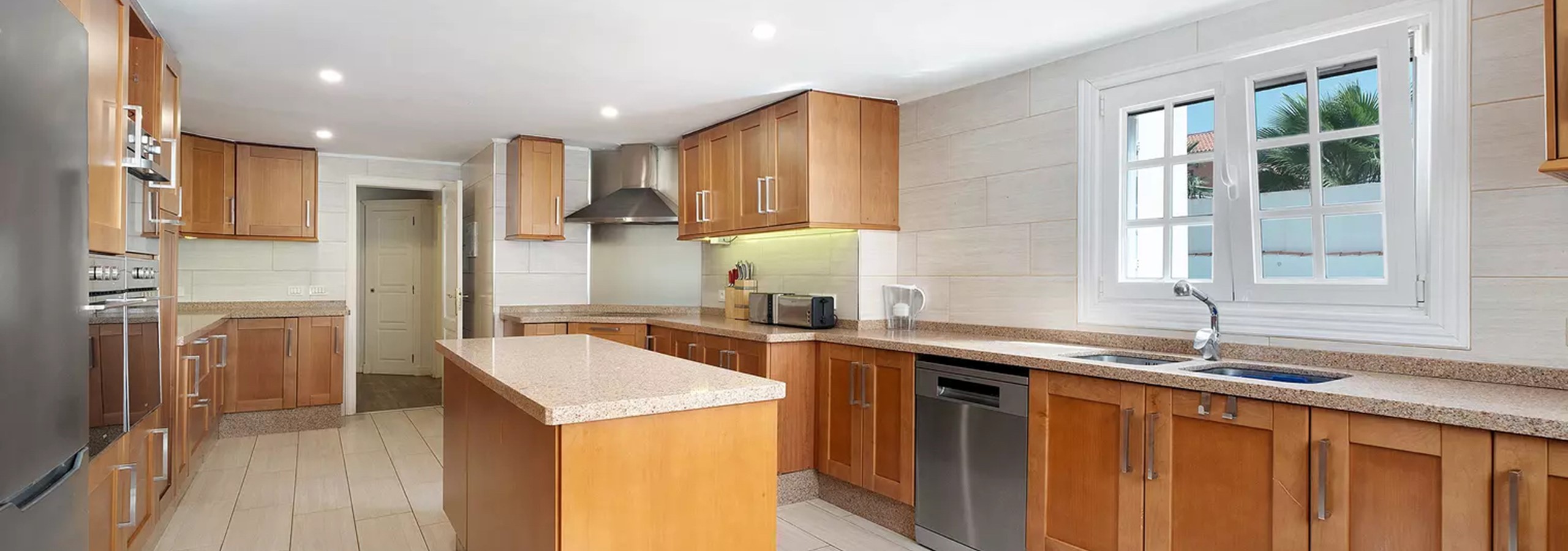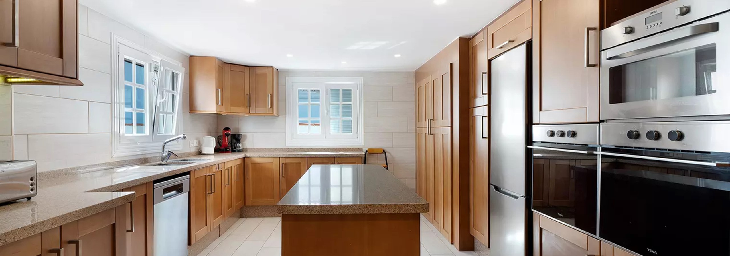 Stepping into Casa Suenos, guests are greeted by a welcoming ambiance. To the right of the entrance hall lies a grand living area, seamlessly connected to an adjacent dining room furnished with a generous dining table and seating for 6-8 guests. A well-appointed kitchen awaits, complete with a central island, dishwasher, 10kg washing machine, and two fridge freezers, ensuring convenience for culinary endeavors. Abundant cupboard space allows for ample storage of provisions and kitchen essentials.